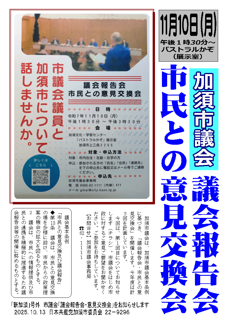 加須市議会「議会報告会・市民との意見交換会」にお越しください 加須市議会は、加須市議会基本条例に基づき、「議会報告会・市民との意見交換会」を開催します。今年度は計3回を計画しています。 今回は、第1回目についてお知らせします(チラシ)。市議会をはじめ市政に対するご意見ご要望をお聞かせください。ご参加をお待ちしています。【お問合せ】加須市議会事務局 ☎62・1111 または今日共産党議員団 コメント コメントを書く コメントを書く コメント送信