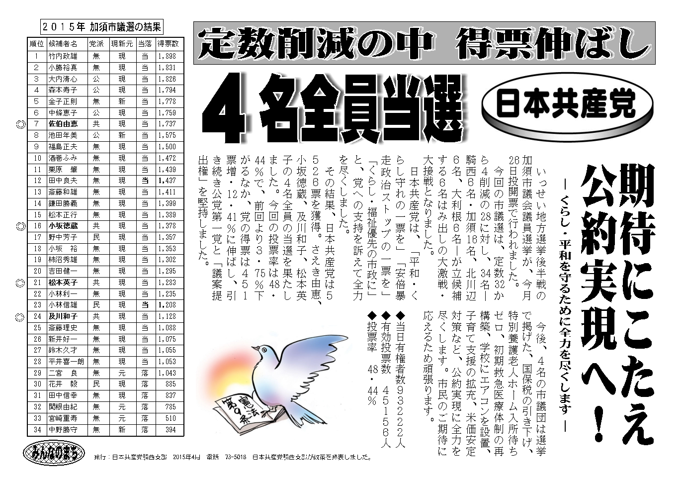 今後、4名の市議団は選挙で掲げた、国保税の引き下げ、特別養護老人ホーム入所待ちゼロ、初期救急医療体制の再構築、学校にエアコンを設置、子育て支援の拡充、米価安定対策など、公約実現に全力を尽くします。市民のご期待に応えるため頑張ります。 -