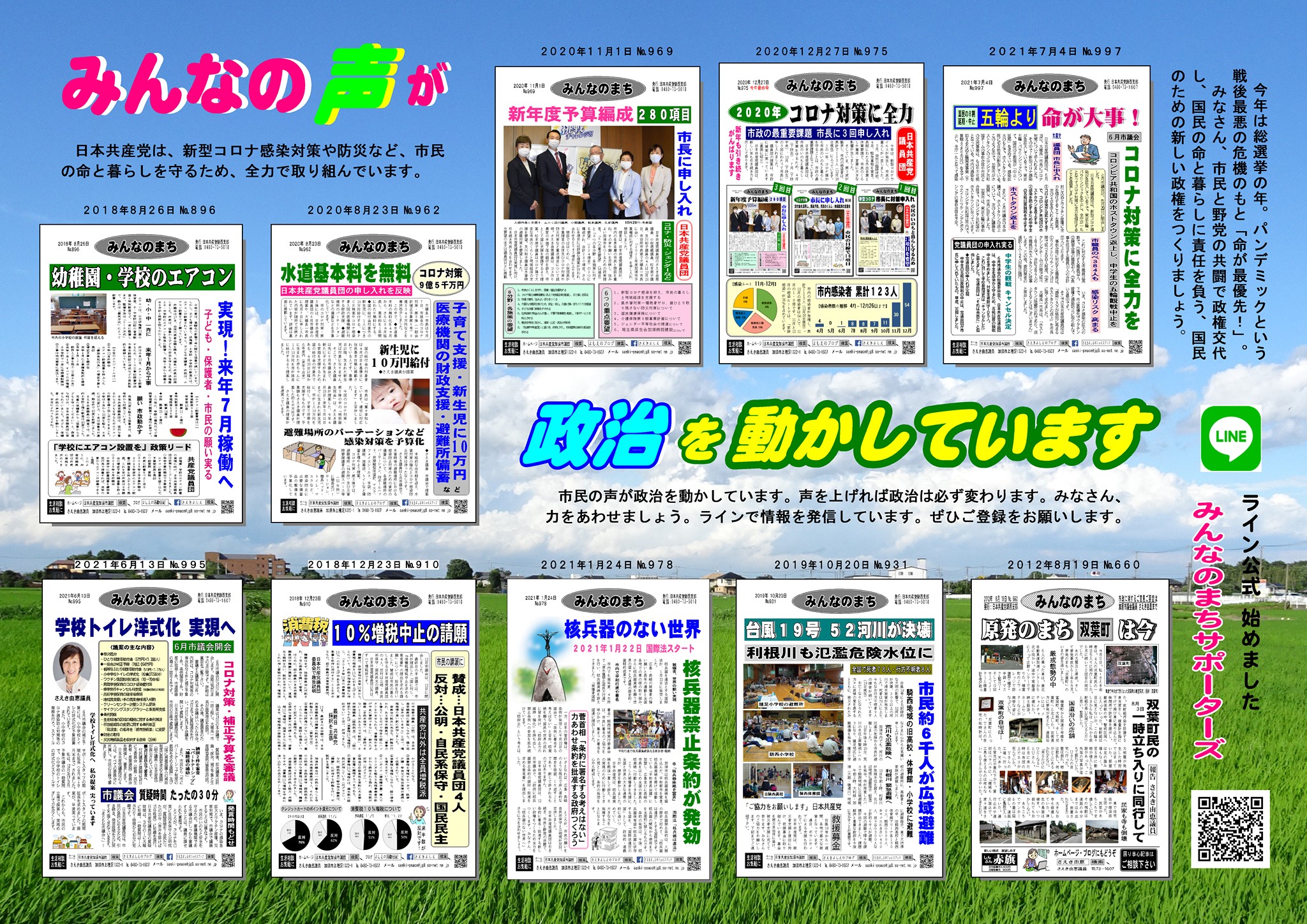 "週刊「新加須」"カテゴリーの記事一覧 地域新聞 「みんなのまち」№1050 2022年10月23日 今週の紙面 臨時市議会27日開催へ 給食費無償化・水道基本料金免除 非課税世帯5万円支給 オミクロン株対応ワクチン 新年度予算要望 市民との懇談議会報告 「みんなのまち」№1033 2022/05/29 1面 新型コロナ 重症化防止へ ・5月感染者 356人(28日時点) ・ワクチン4回目 60歳以上と基礎疾患 計5万人 ・60歳以上 5カ月経過 接種券発送 ・基礎疾患等 申請を 2面 ・第3次救急医療・救命救急センター 「済生会加須病院」 6月開院 ・外来は6月3日から ・6月市議会 14日開会 ・角田新市長が「所信表明」 ・新たな市政運営 議論スタート 「市政に対するご意見をお寄せ下さい」 みんなのまち創刊1000号 全戸配布へ みんなのまち創刊1000号 日本共産党騎西支部が発行する、週刊「みんまのまち」は、市民のみなさんに支えられ、今年8月1日、創刊1000号を迎えました。 「みんなのまち」創刊1000号が完成。全戸配布を準備中です。まもなく全戸にお届けします。 ライン公式「みんなのまちサポーターズ」にぜひご登録をお願いします。 12/27 地域新聞「みんなのまち」№975 ◆202012/27 地域新聞「みんなのまち」№975 【記事の内容】2020年最終号コロナ対策・防災に全力市長に3回申し入れ党議員団の提案実る市内のコロナ感染者累計123人(26日現在) 「一年間お世話になりました。良いお年を」 12/20 地域新聞「みんなのまち」№974 ◆2020/12/20 地域新聞「みんなのまち」№974を発行しました。【記事の内容】12月市議会報告「市民の願いを国に」 「米価安定を求める請願」が採択(趣旨) 2つの意見書に自民系保守、公明党が反対し否決 ・「少人数学級の実現」 ・「核兵器禁止条約に調印」市内のコロナ感染者累計85人(18日現在)発熱外来 市内9医療機関で受診できます 11/29 週刊新聞「みんなのまち」№972 ◆週刊新聞「みんなのまち」№972を発行しました。 【記事の内容】12月市議会 市民の目線で質疑・質問 ・11/30 日本共産党議員団が質疑します ・12/1 午前10時10分頃~ 私が一般質問をします済生会加須病院 2022年6月に開院コロナ 市内感染者68人に 11/22 地域新聞「みんなのまち」№971 ◆地域新聞「みんなのまち」№971 2020.11.22 発行しました。 【記事の内容】▼12月市議会が開会 26議案を審議日本共産党議員団 2意見書を提出へ ・「少人数学級の実現を求める意見書」 ・「核兵器禁止条約に政府の調印を求める意見書」「米価の安定を求める請願」紹介議員:日本共産党党議員団4人の一般質問会期日程 11/25~12/10 16日間