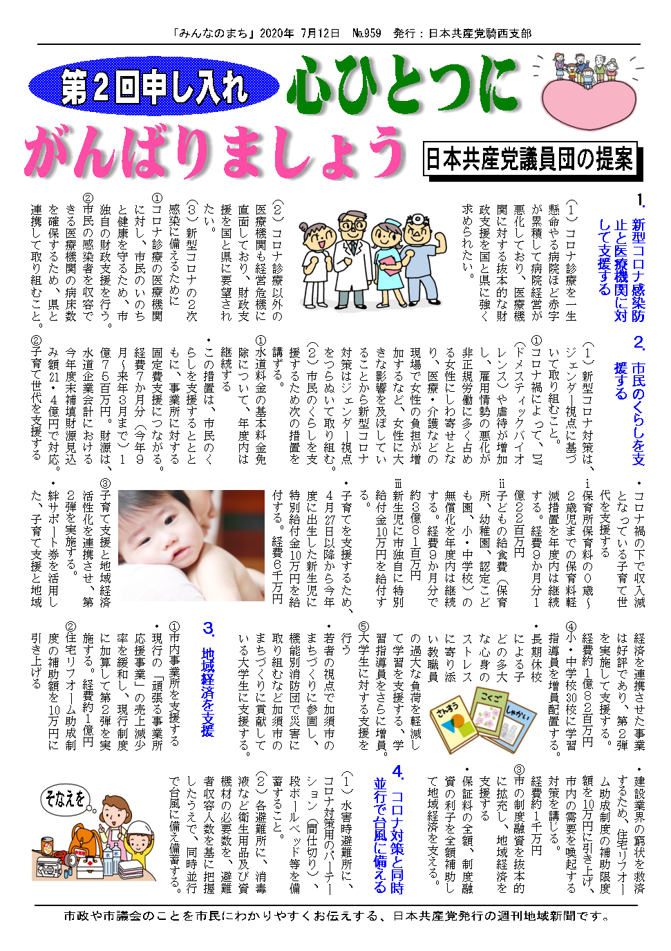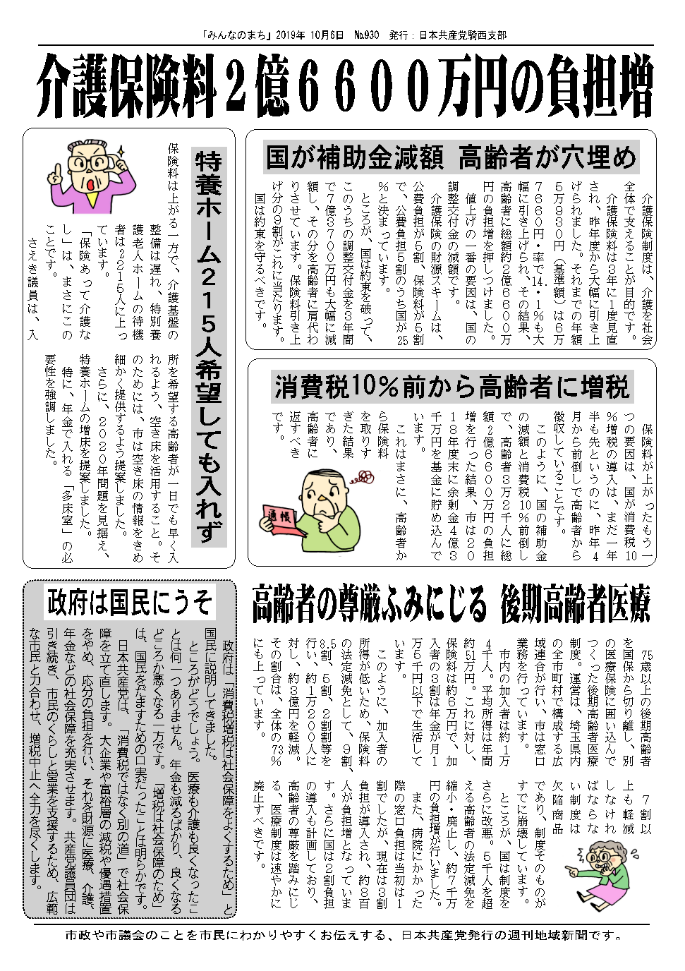 "週刊「新加須」"カテゴリーの記事一覧 8/22 地域新聞「みんなのまち」№961 2020.8.9発行 ◆掲載が遅くなってしまいましたが、8月9日に発行した「みんなのまち」です。 【記事の内容】 ・塩川鉄也衆議院議員が加須市の広域避難を調査... ・議員団 利根川洪水対策「国への要望」 ・防災ラジオ 騎西でも「聞こえない」 ・「コロナ感染抑制へ」共産党が緊急申し入れ ・9月市議会 9月1日開会予定 「質疑・質問時間を元に戻すこと」 7/12 地域新聞「みんなのまち」 №959 7月12日発行 地域新聞「みんなのまち」 №959 2020年 7月12日発行しました。 【記事の内容】 ◆コロナ対策 市長に申し入れ 日本共産党議員団... 「地方創生臨時交付金を活用し、 感染予防、市民のくらし・地域経済を支援する申し入れ」 ・申し入れは全部で16項目 ・全項目を掲載(裏面) 6/28 地域新聞「みんなのまち」 №957 地域新聞「みんなのまち」 №957 2020年6月28日 【記事の内容】◆6月市議会 ◇追加議案「コロナ対策・第4弾」3億379万円 共産党議員団の提案を反映 ・学童保育への財政支援 ・医療機関への財政支援 ・ひとり親家庭の支援 ・教育スタッフの配置など ◇「コロナ対策・第3弾」1億5975万円 日本共産党共産党議員団が質疑 ・保育所0~2歳児の保育料 年度内無償化へ ・保育所、幼稚園、小中学校の給食費 年度内無償化へ ◇党議員団の提案「実っています」 ◇市内で5例目の感染者 6/21 地域新聞「みんなのまち」 №956 地域新聞「みんなのまち」 №956 2020年6月21日【記事の内容】◆6月市議会 一般質問の報告 コロナ感染と子育て支援を提案 「新生児に10万円給付を」 「学童保育に財政支援を」 「就学援助の中途適用を」 防災対策と感染防止を提案 「避難場所に資材の備蓄を」 「3密防止、ソーシャルディスタンスの確保を」 地域新聞「みんなのまち」 №931 10/20 地域新聞「みんなのまち」 №931 2019年10月20日 【記事の内容】 「台風19号 52河川が決壊」 ・利根川も氾濫危険水位に ・荒川も氾濫危険に ・市民約6千人が広域避難 ・河川の水位危険度レベル ・市内の被害状況 地域新聞「みんなのまち」№930 10/6 地域新聞「みんなのまち」№930 2019年10月6日【記事の内容】 「消費税増税は社会保障のため」は大うそ 社会保障は軒並み第改悪! ①国保税1億円の大増税 ②介護保険料2億6600万円の負担増 ③高齢者の尊厳を踏みにじる後期高齢者医療 地域新聞「みんなのまち」№929 9/22 地域新聞「みんなのまち」№929を発行しました。 保育所の副食費(おかず代とおやつ代)の実費徴収について ・保護者負担に対する反対討論 ・保護者負担を免除する、議員団の修正案 についてまとめました。