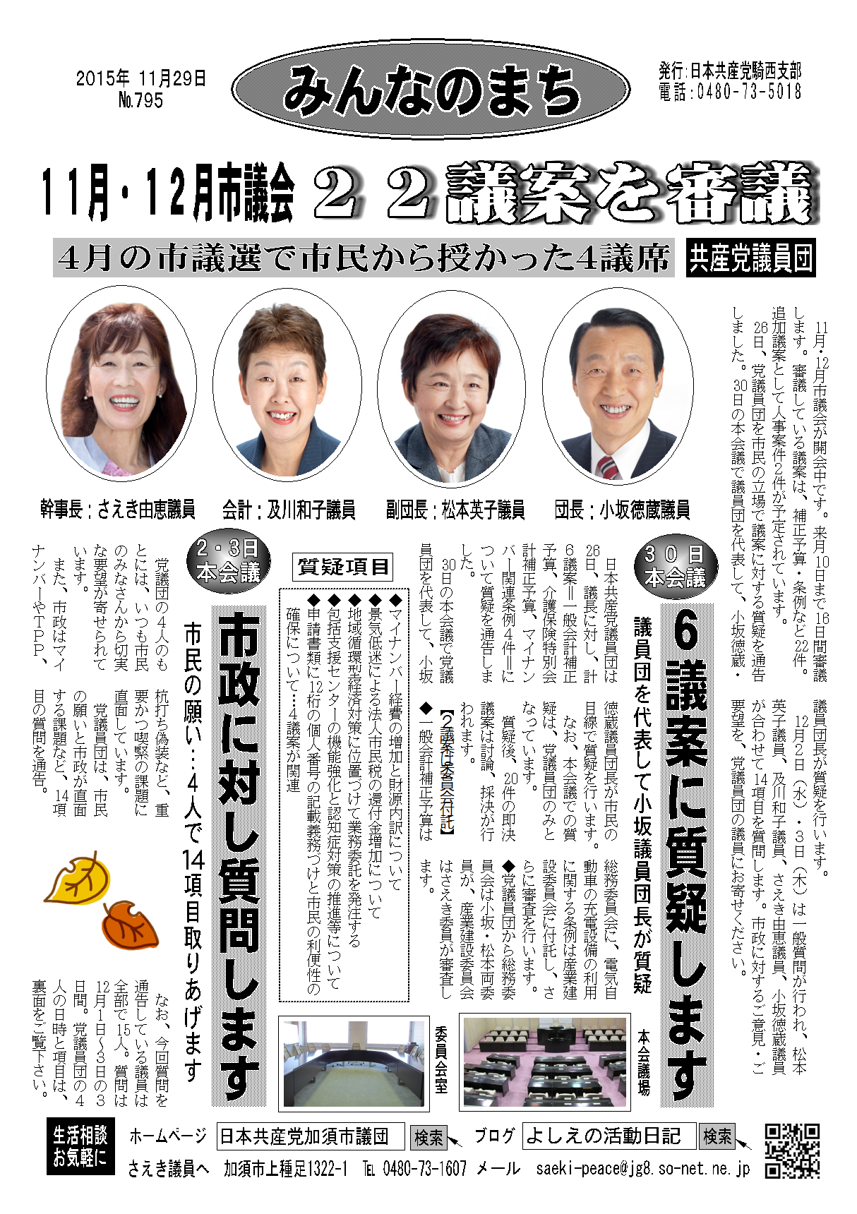 質疑は6議案(2015年度一般会計補正予算、介護保険特別会計補正予算、マイナンバー関連条例4件)。次の5項目について、市民の目線に立って質疑しました。