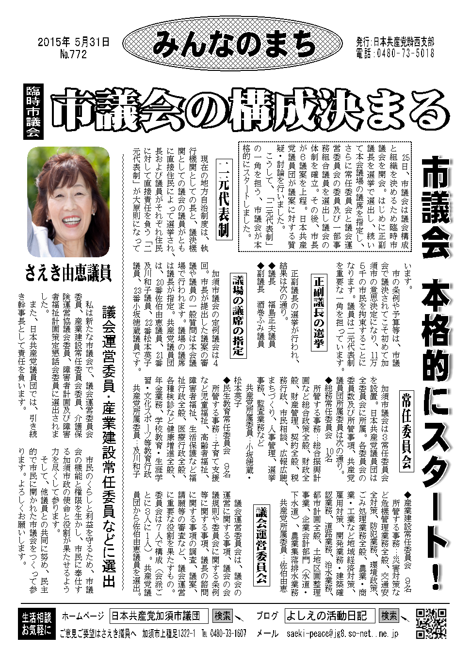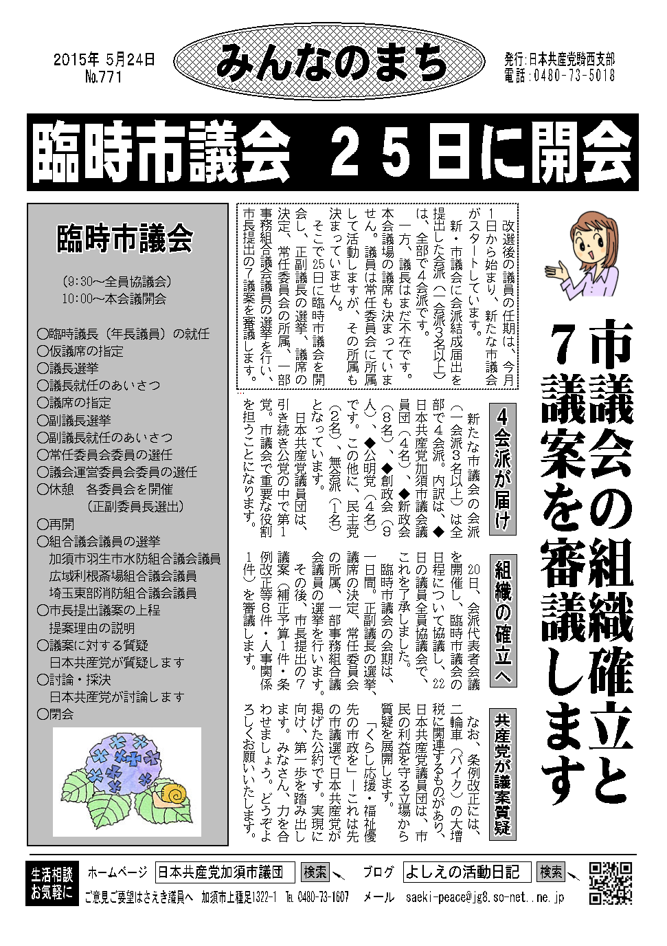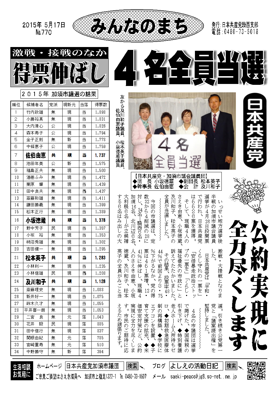 参加者はまず、千方神社境内で集会を開催。はじめに実行委員長があいさつ。続いて、大橋良一市長があいさつ。上田清司・埼玉知事の祝電を紹介したあと、日本共産党を代表し、小坂徳蔵議員団長があいさつ。 小坂団長は、まず市議選で激戦を競り勝った党議員団のさえき議員、松本議員、及川議員を紹介。