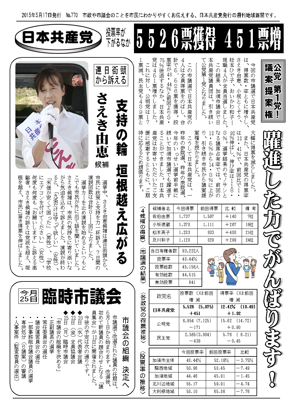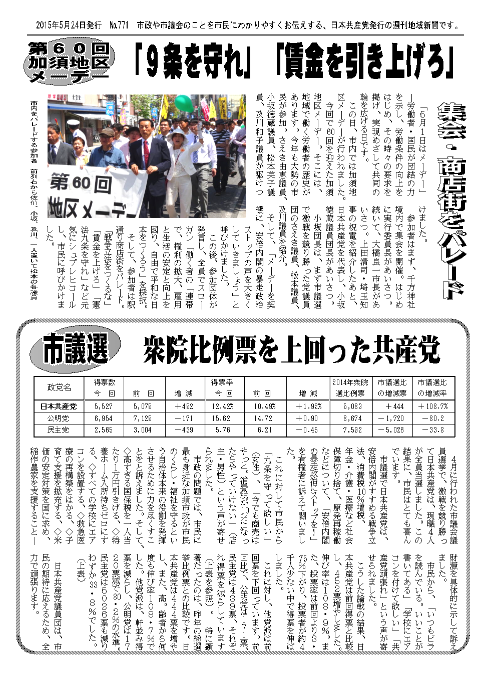 今回で60回を迎えた加須地区メーデー。そこには、地域で働く労働者の歴史があります。今年も大勢の市民が参加。さえき由恵議員、小坂徳蔵議員、松本英子議員、及川和子議員が駆けつけました。