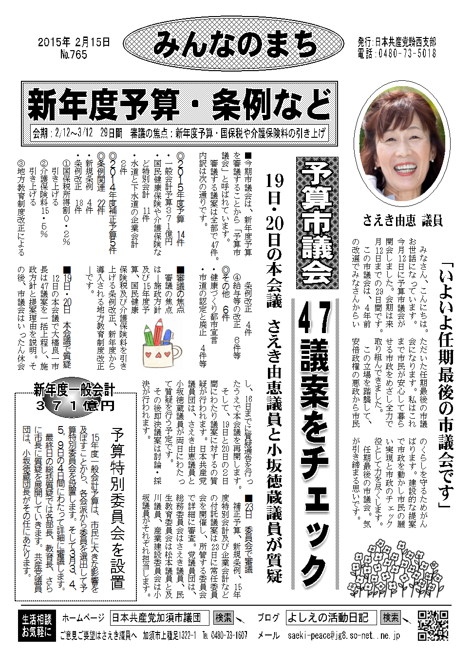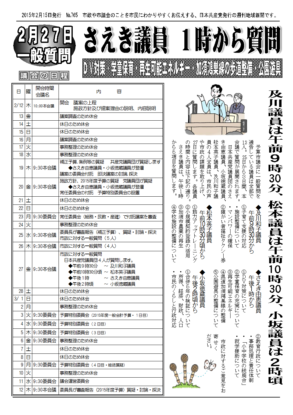 審議する議案は、新年度予算や条例など47件(下)。市民の目線で議案をチェックします。