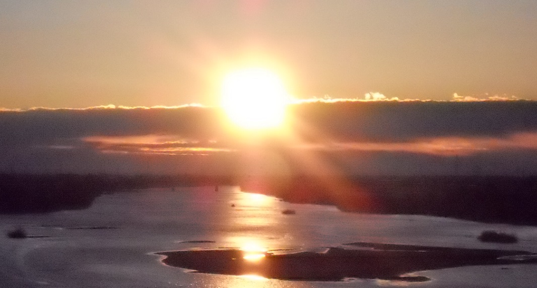 7時近く、垂れ込めた雲の上からやっと姿を現しました。輝きは雲にさえぎられています。