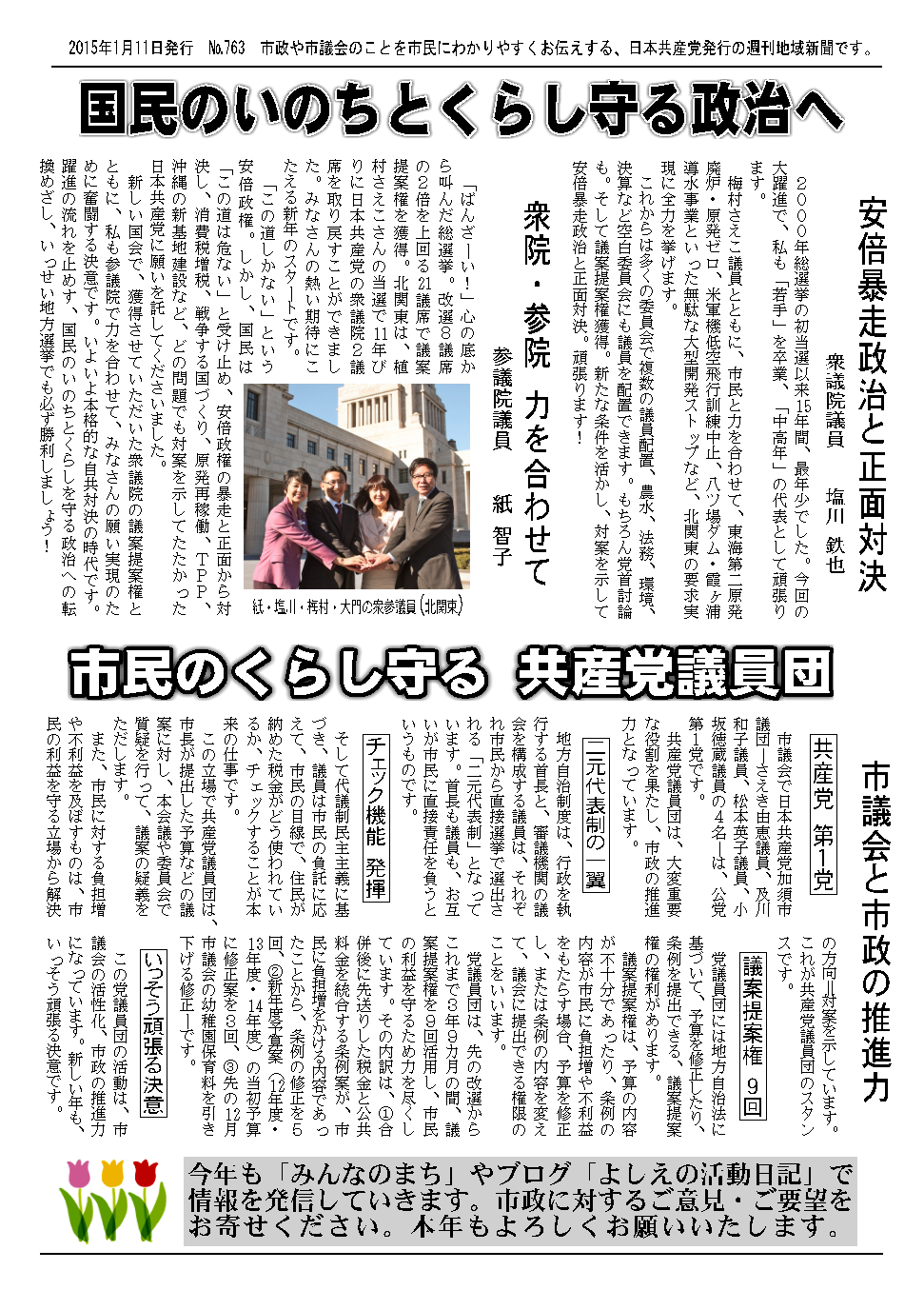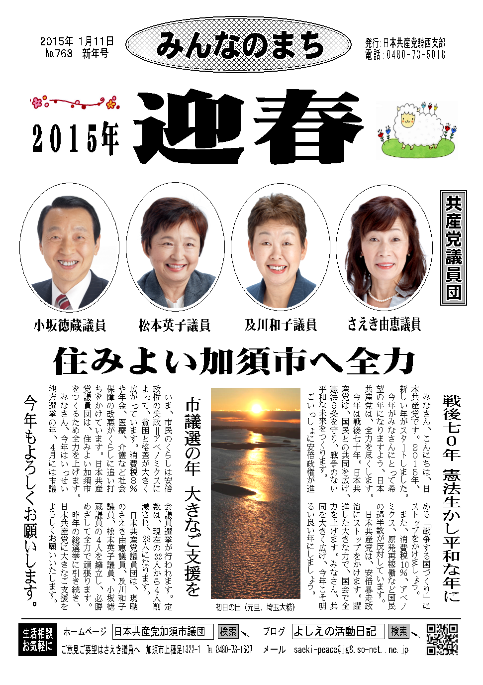 今年は、いっせい地方選挙の年。4月26日は市議会議員選挙が行われます。わが議員団は市議会の中で「第一党」。引き続き、現職4人の再選めざし全力を上げます。騎西地域では、私・さえき由恵が頑張ります。地方政治でも躍進の花を開かせるため、奮闘します。