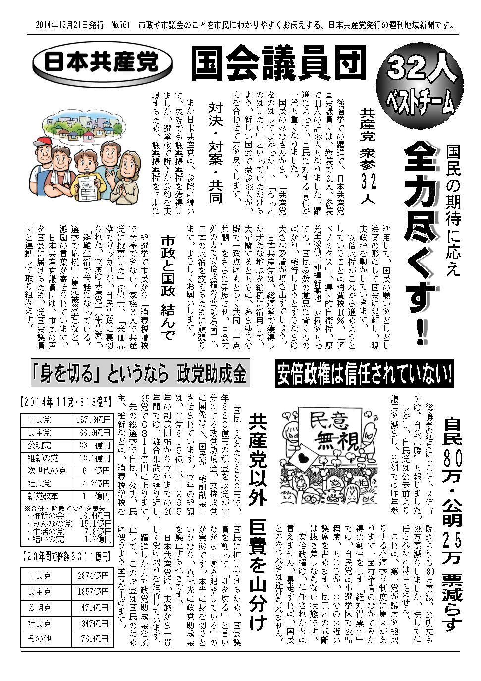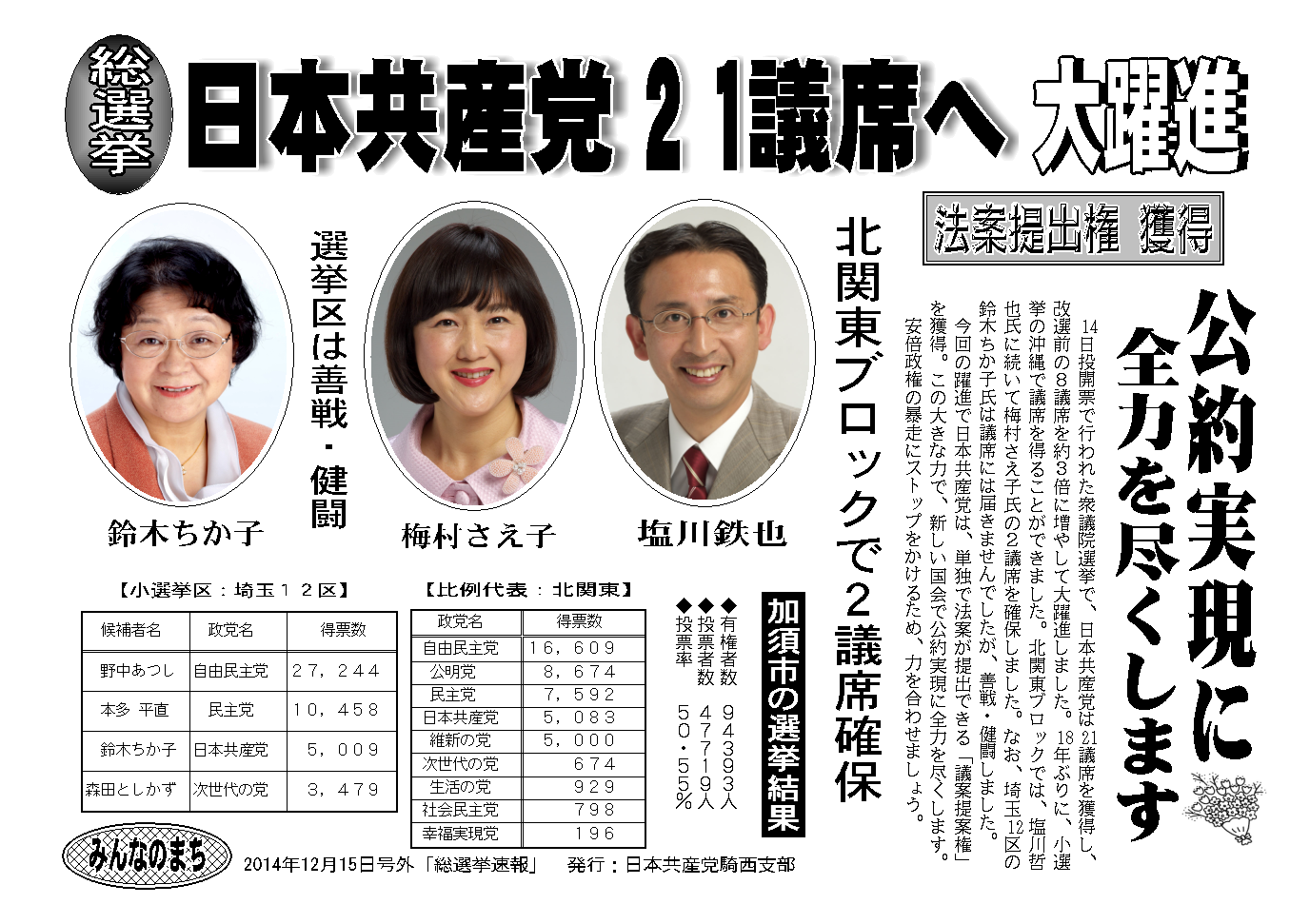 今回の躍進で、共産党は独自に法案を提出できる権利を獲得しました。この大きな力で、公約実現に全力を尽くします。 国民のみなさんからお寄せ頂いたご期待に応えるため頑張ります。みなさん、安倍政権の暴走にストップをかけるため、力を合わせましょう。