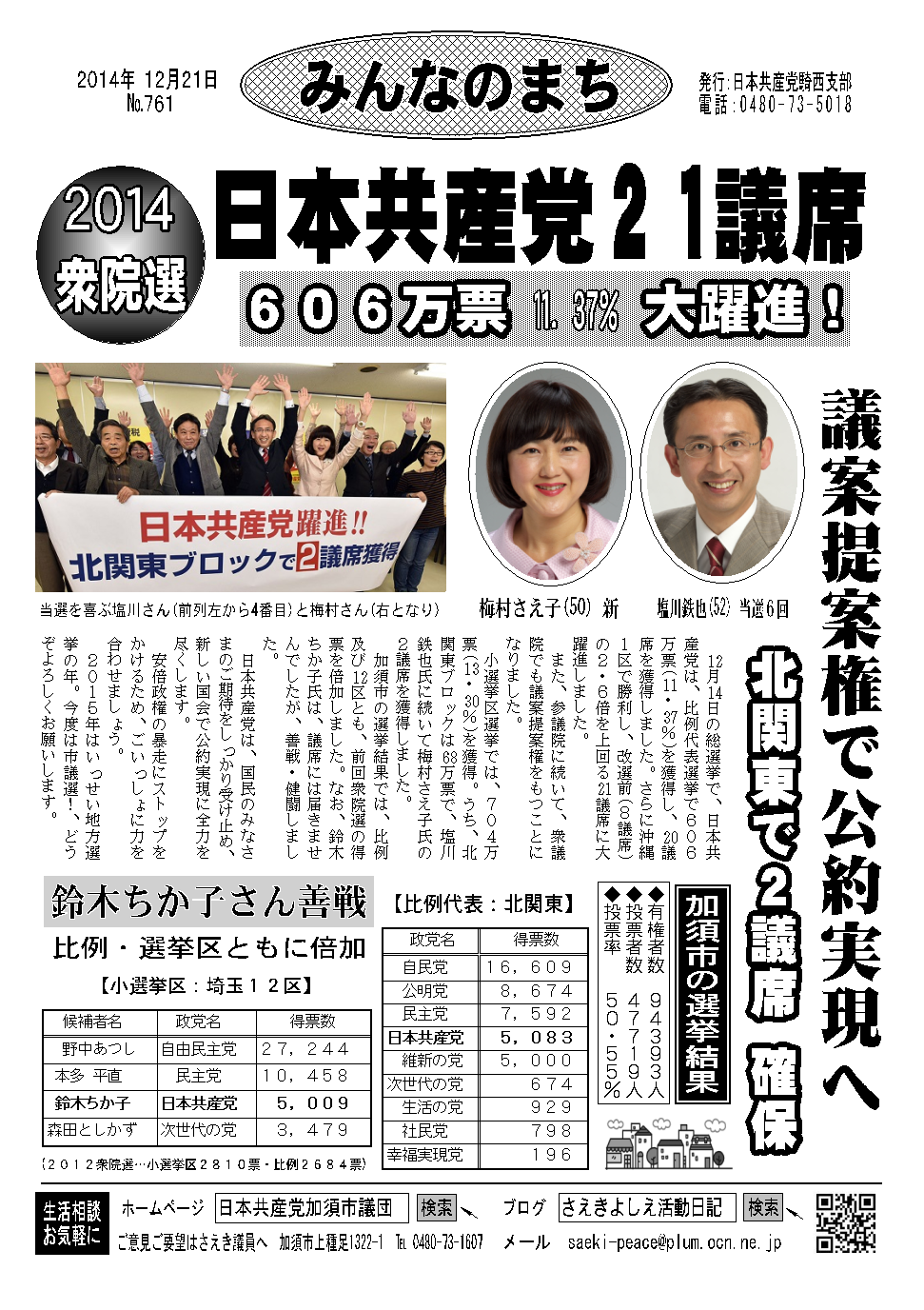 今日15日は、未明に号外「総選挙結果」を発行。終日、総選挙結果を告げる、共産党の宣伝カーを走らせました。寒い中、市民にみなさんが手を振って歓迎してくれました。また、ポスター掲示をご協力していただいているお宅を訪ね、総選挙の報告とポスターご協力の感謝を申し上げました。