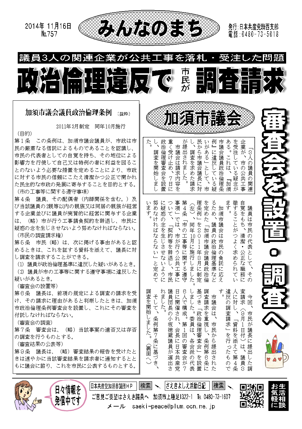 この問題は、3人の議員の親族企業が公共工事を受注しているのは、政治倫理条例に違反している疑いがあるとして、市民が議長に調査請求を提出したことによるもの。