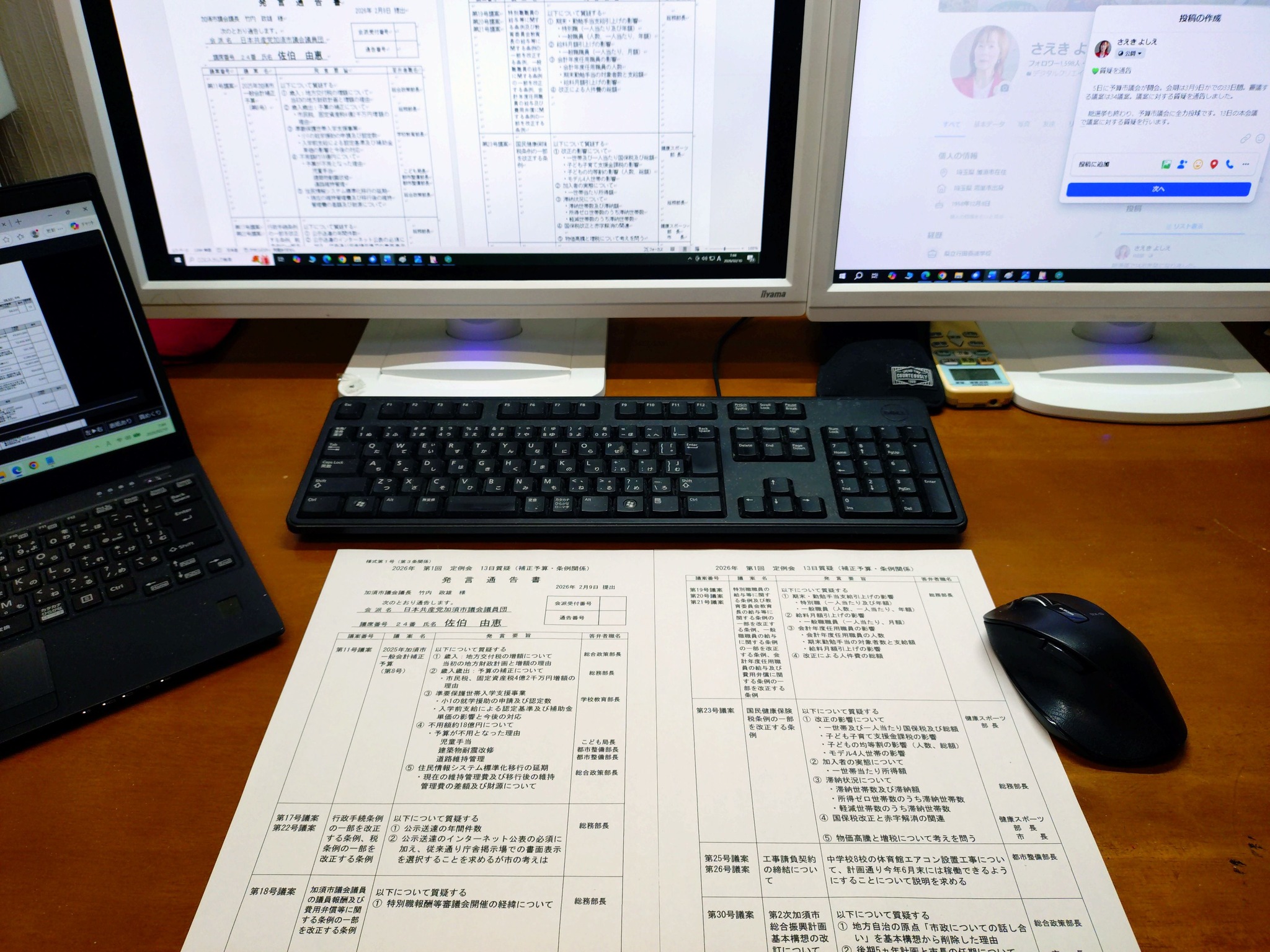 予算市議会が5日に開会。会期は3月9日までの33日間。審議する議案は34議案。総選挙も終わり、予算市議会に全力投球です。いよいよ13日から議案に対する審議が始まります。私は7議案に対する質疑を通告しました。13日の本会議で議員団を代表し、市長はじめ担当部長に質疑します。市長は任期最後の市議会に、国民健康保険税を約3億5千万円も引き上げる議案を提案しています。物価高騰で苦しむ市民に大増税とは…市長に増税撤回を求めて質疑します。◆質疑のおもな内容◆・物価高騰対策・不用額の問題:予算は市民のために活用を・特別職のボーナス引上げの問題・国保税3億5千万円の大増税問題・中学校体育館のエアコン設置・地方自治の原点「市政についての話し合い」の継続・総合振興計画後期5カ年計画と市長に任期 など
