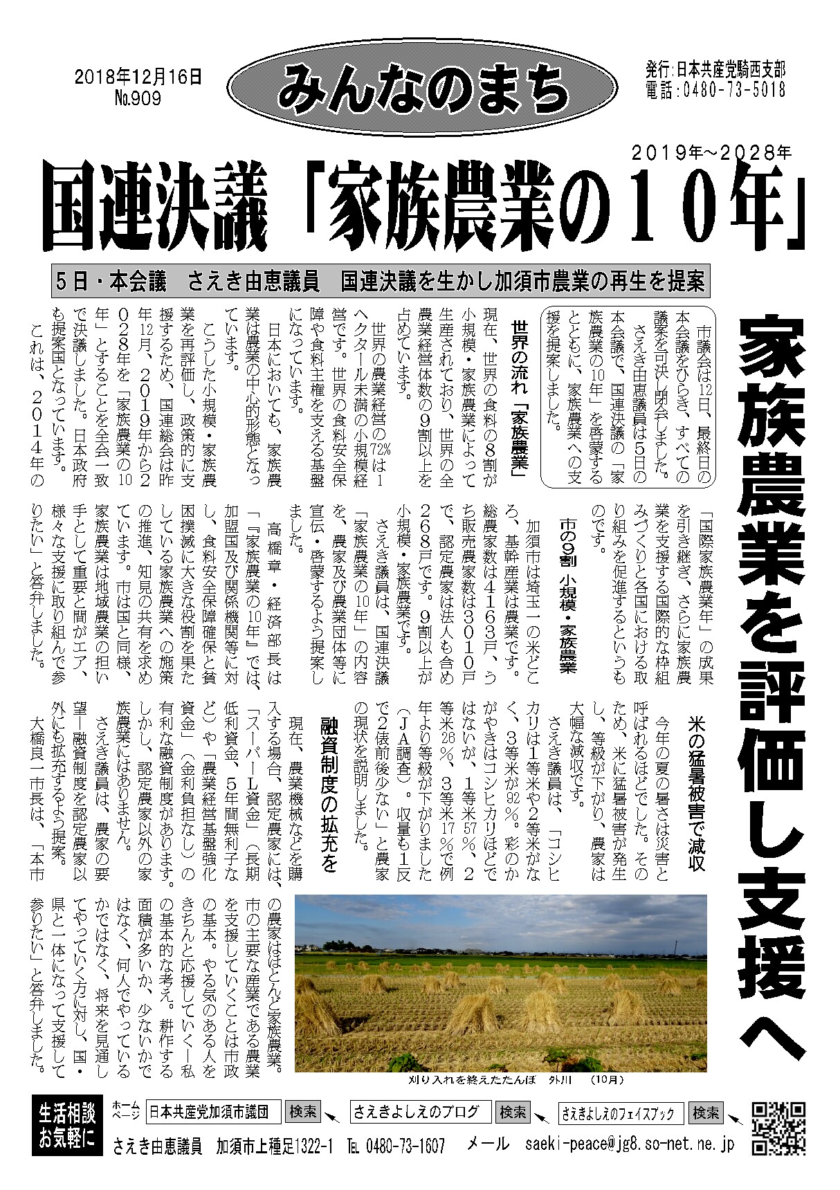 私は5日の本会議で、国連の「家族農業の10年」を啓蒙するとともに、家族農業への支援を提案しました。以下が要旨です。
