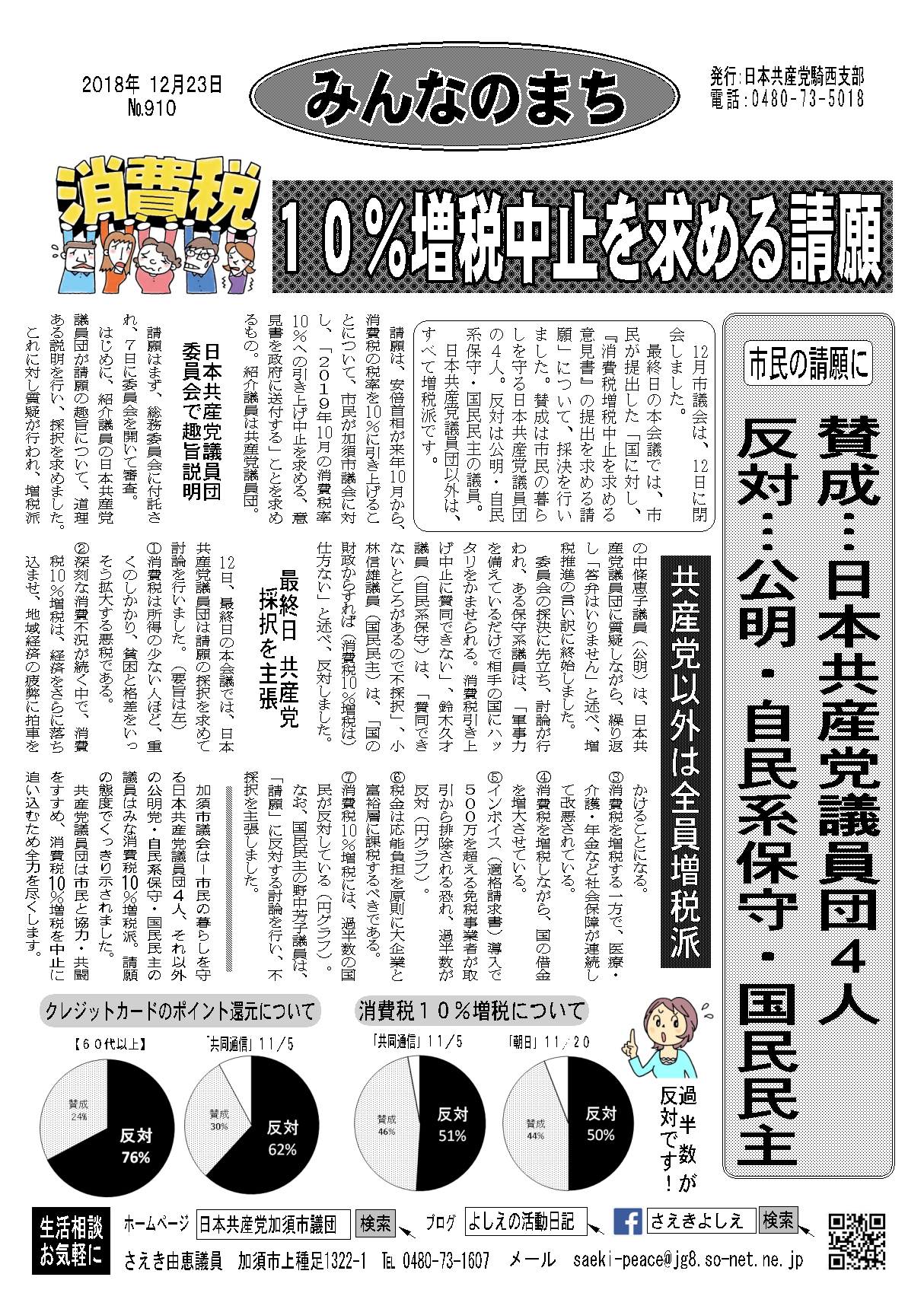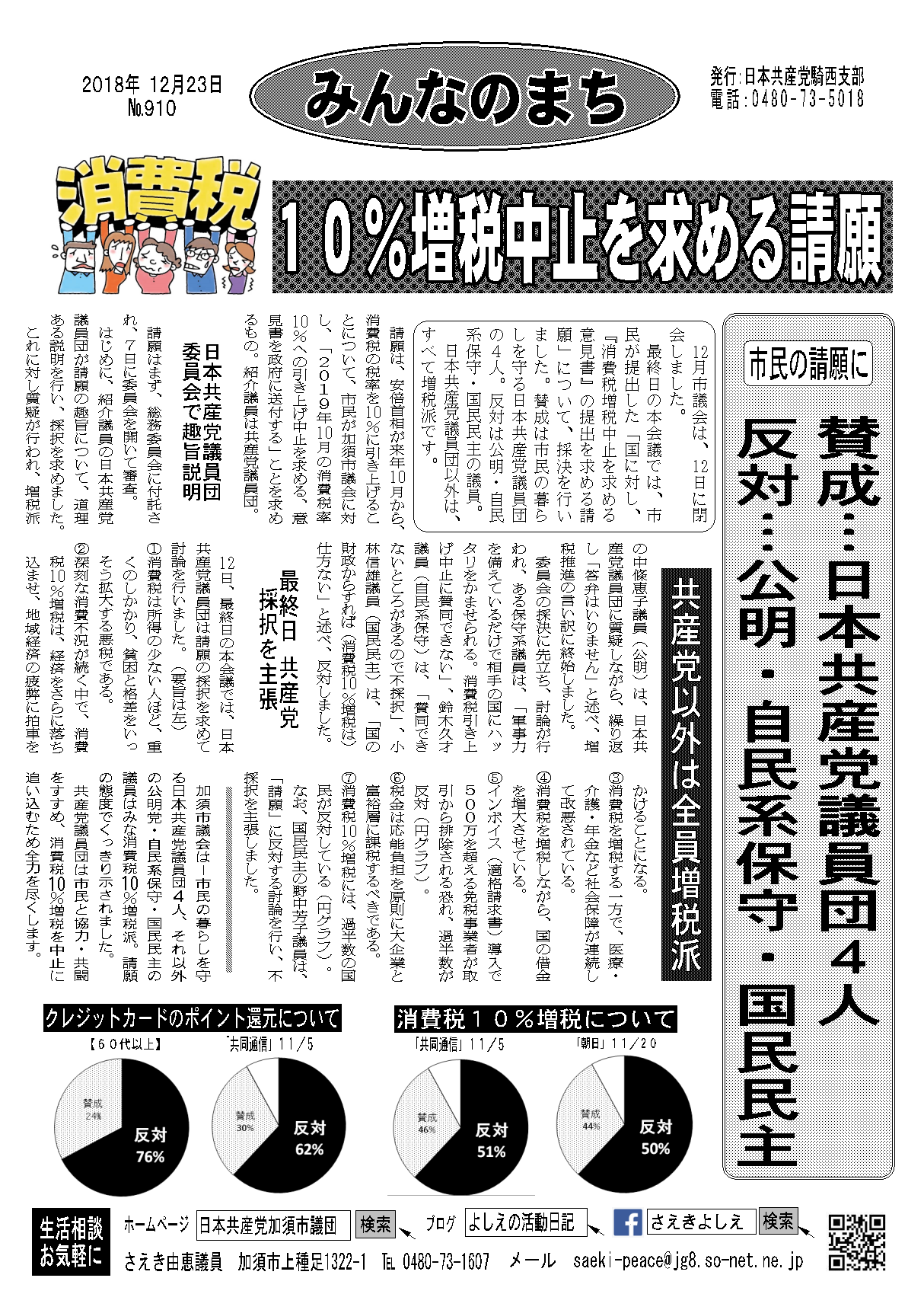 共産党議員団は、市民が提出した「消費税10%中止を求める請願」について、採択を求めて討論を行いました。