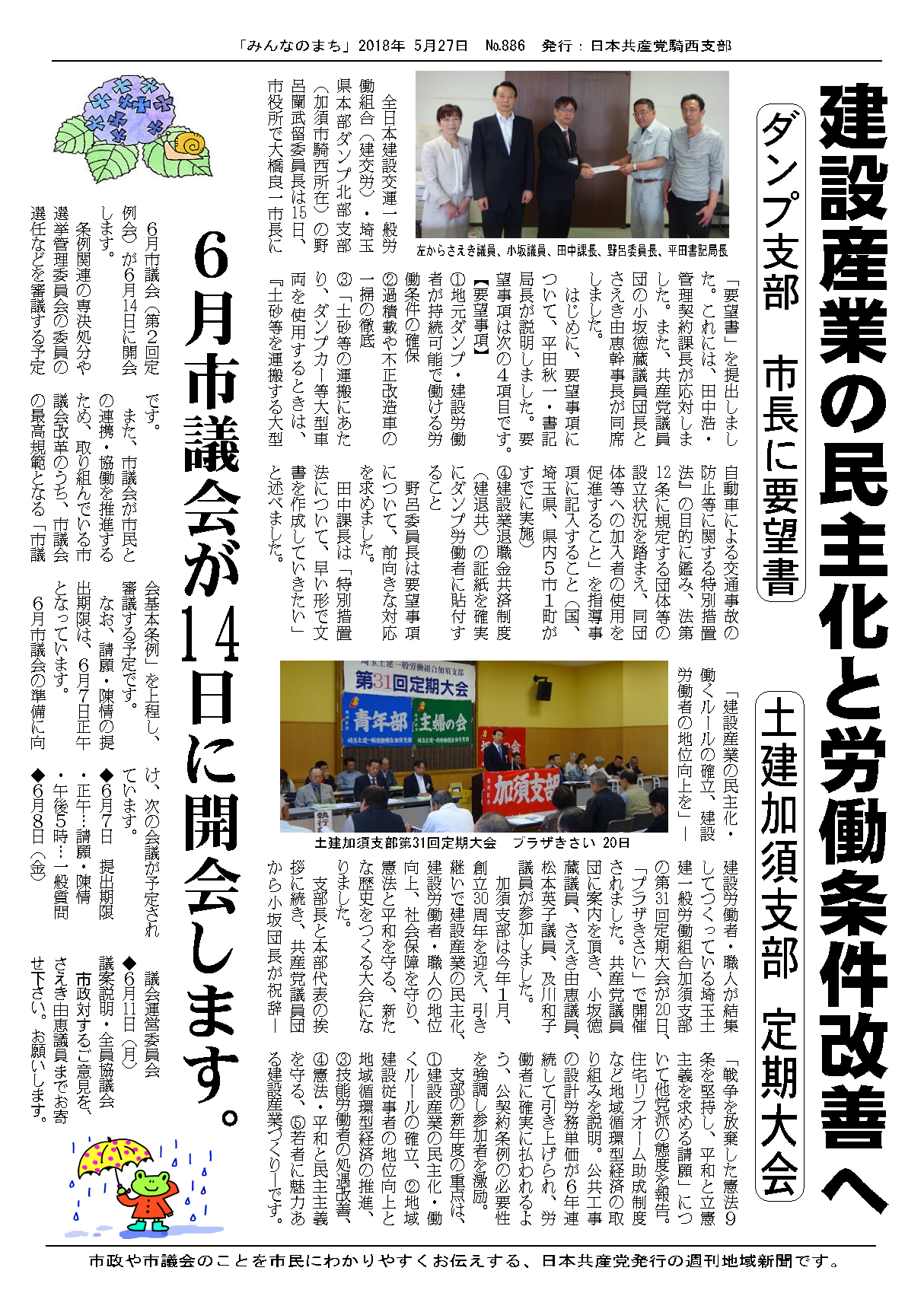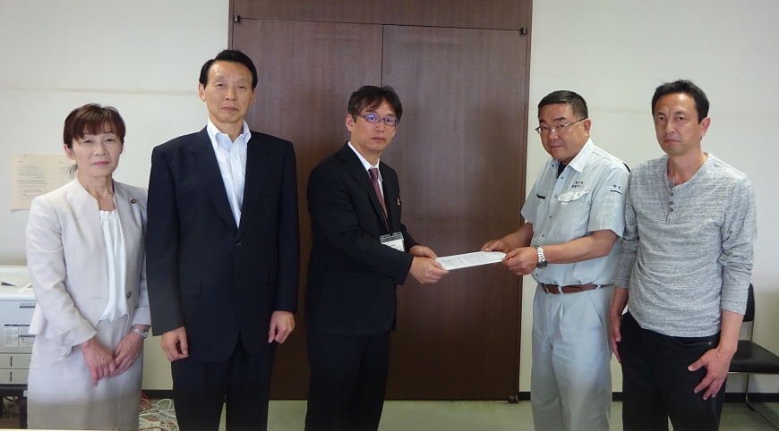 左から佐伯議員・小坂議員・田中課長・野呂委員長・平田書記局長 全日本建設交運一般労働組合(建交労)・埼玉県本部ダンプ北部支部(加須市騎西)の野呂武留委員長は15日、市役所で、持続可能な労働条件の確保や土砂等運搬特別措置法の対応などを求め、大橋良一市長に対し「要望書」を提出しました。