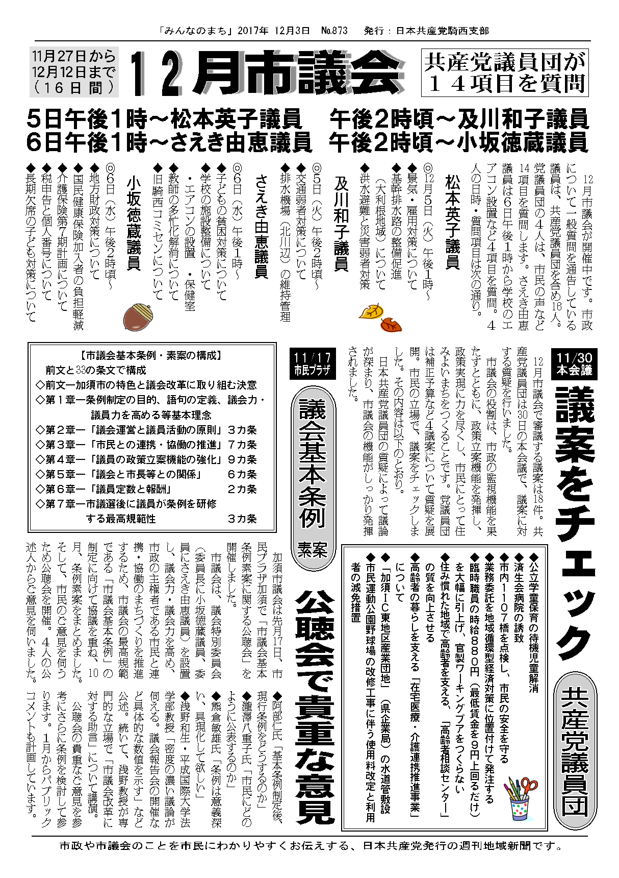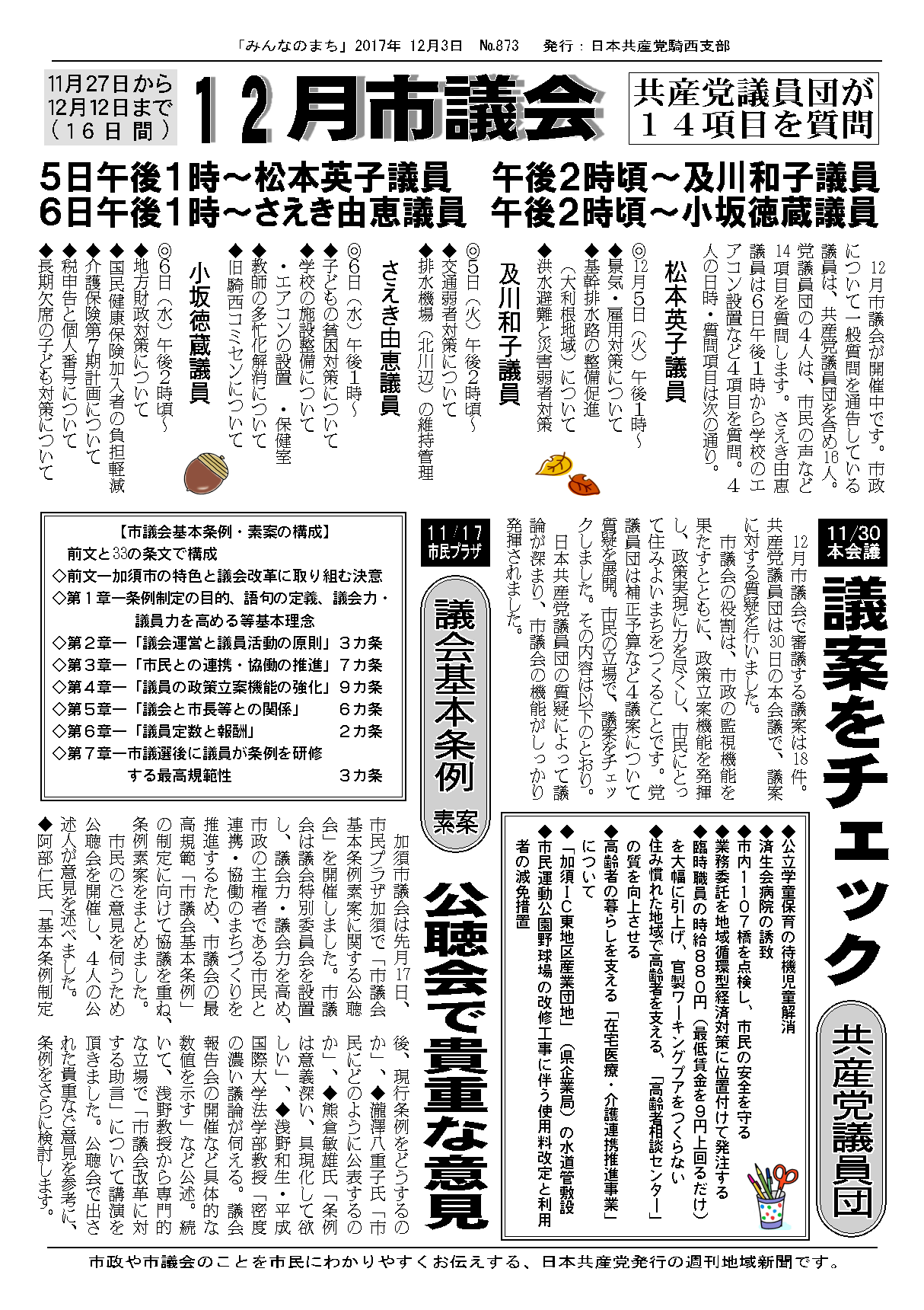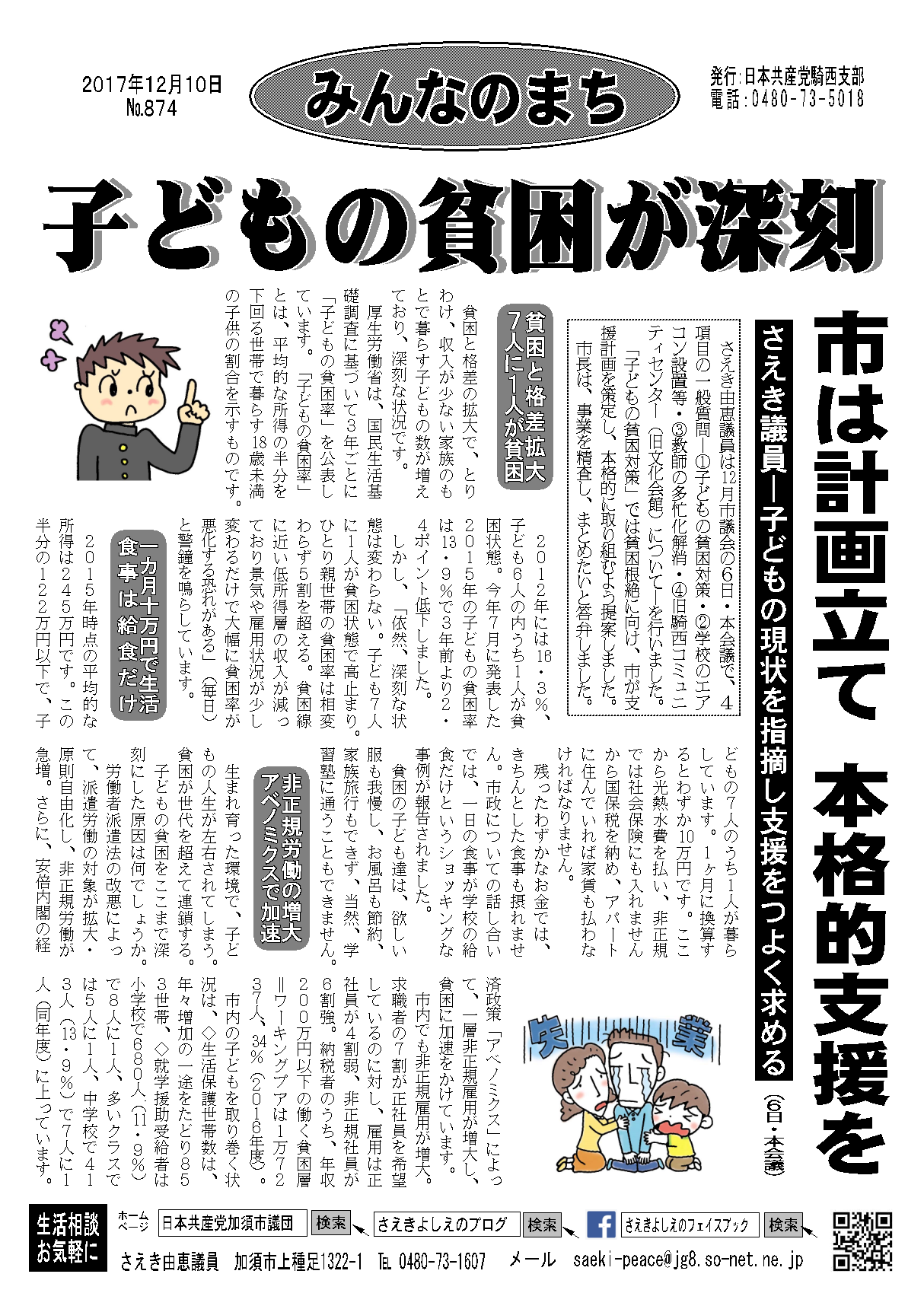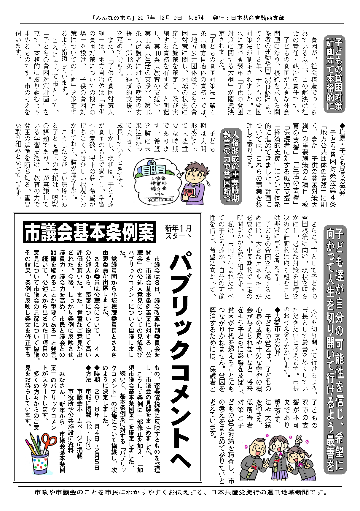 12月市議会が12日に閉会しました。私は6日の本会議で、4項目について一般質問を行いました。「子どもの貧困対策」では、子どもの貧困を根絶するため、市が計画を策定して、本格的に取り組むよう提案しました。以下が要旨です。