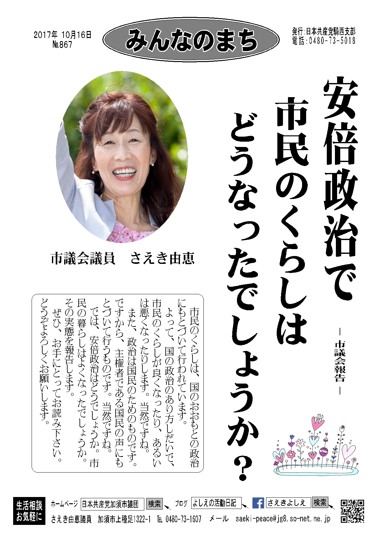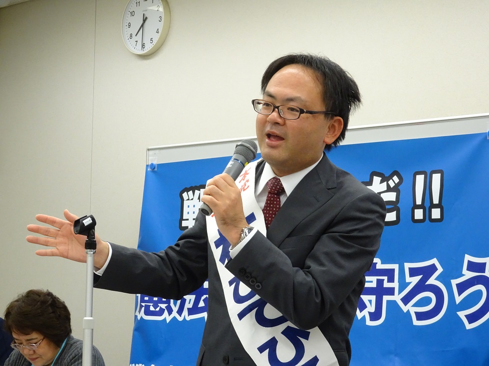 みなさん、選挙はこれからです。市民と野党の共闘で、安倍政治の暴走を止める選挙にしましょう。消費税10%を中止する選挙にしましょう。憲法9条を守る選挙にしましょう。みんなで世直ししましょう。
