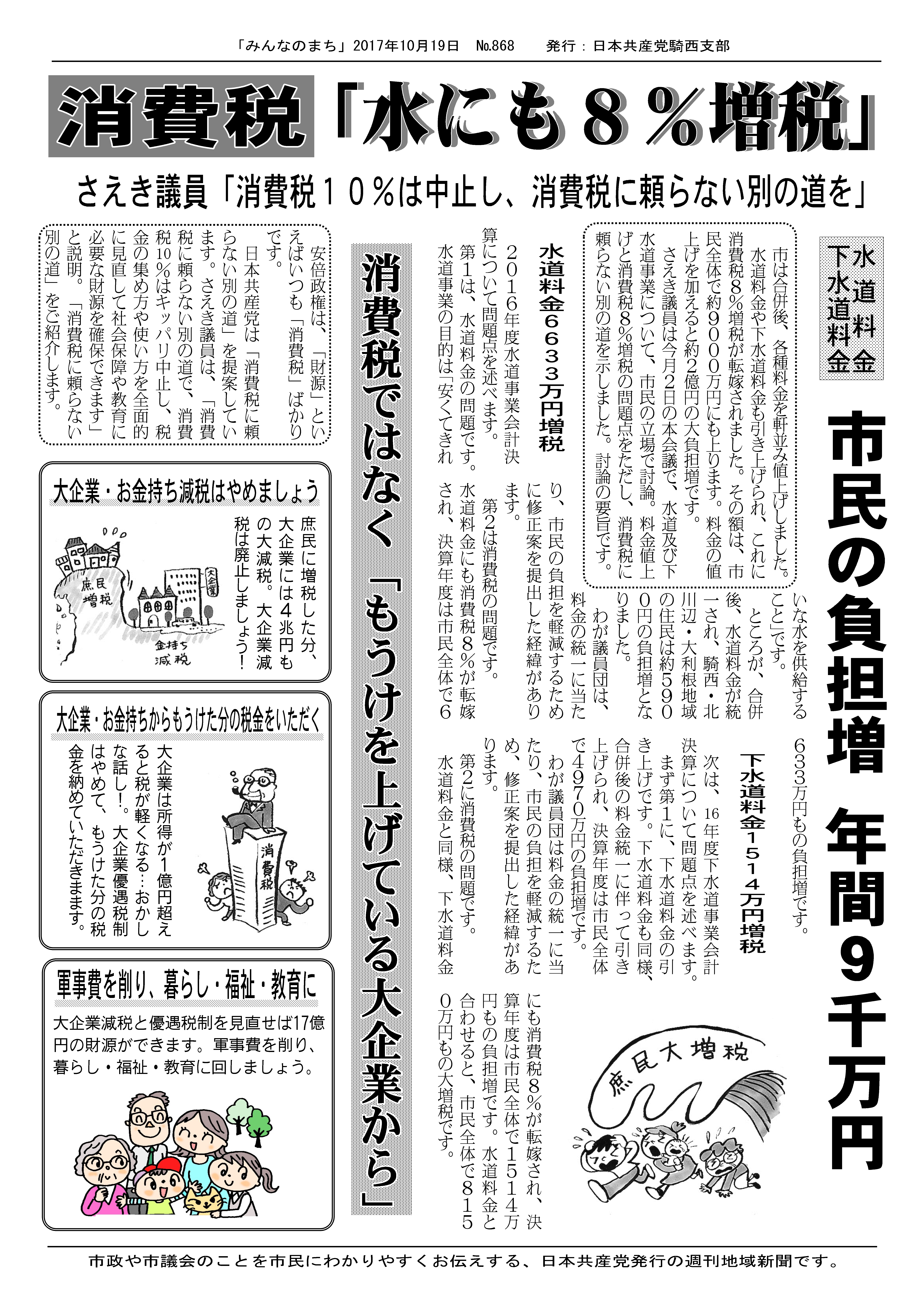 市は合併後、各種料金を軒並み値上げしました。水道料金や下水道料金も引き上げられ、これに消費税8%増税が転嫁されました。その額は、市民全体で約9000万円にも上ります。料金の値上げを加えると約2億円の大負担増です。
