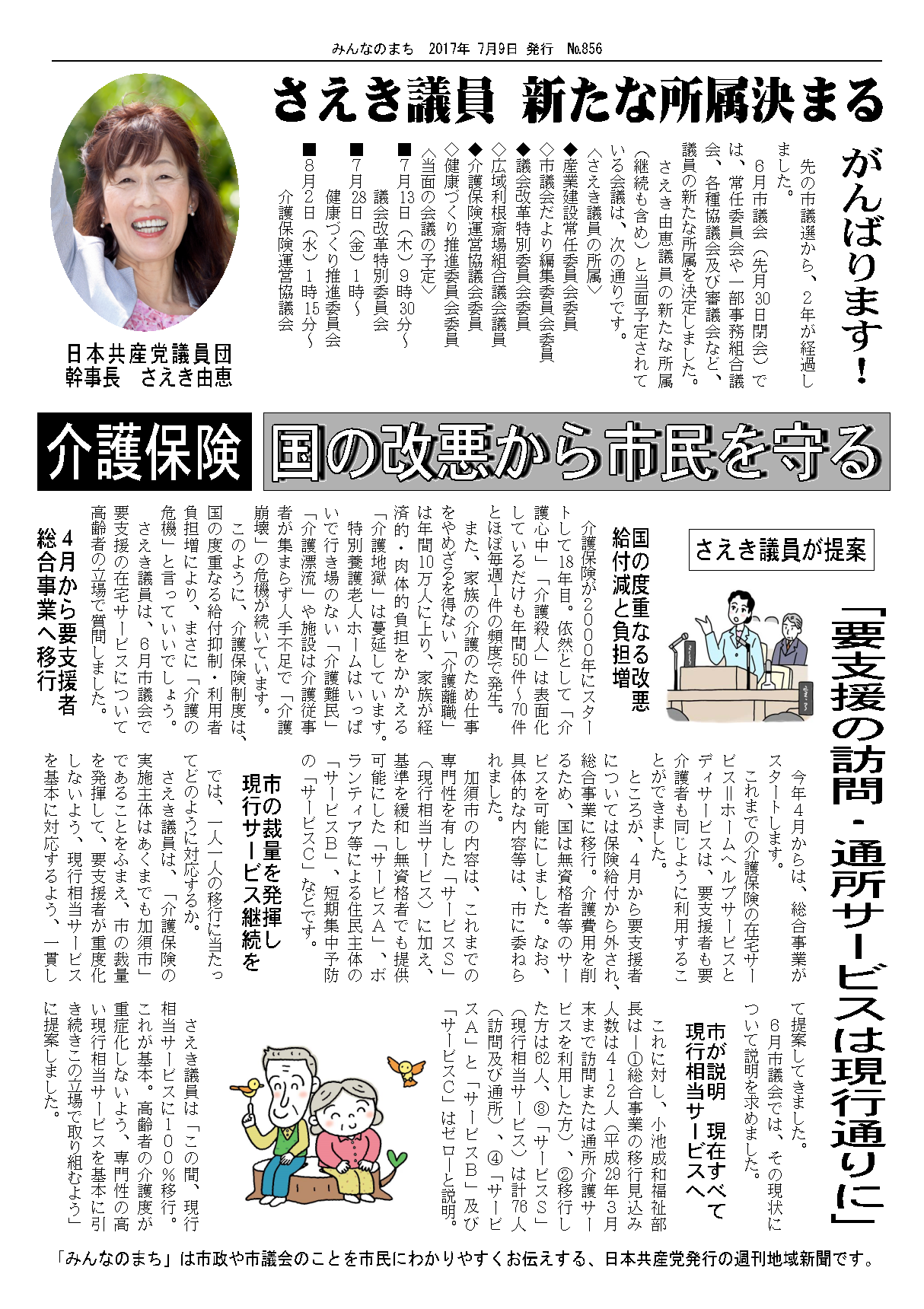 このように、介護保険制度は、国の度重なる給付抑制・利用者負担増により、まさに「介護の危機」と言っていいでしょう。私は、6月市議会で要支援の在宅サービスについて高齢者の立場で質問しました。今年4月からは、総合事業がスタートします。これまでの介護保険の在宅サービス=ホームヘルプサービスとディサービスは、要支援者も要介護者も同じように利用することができました。