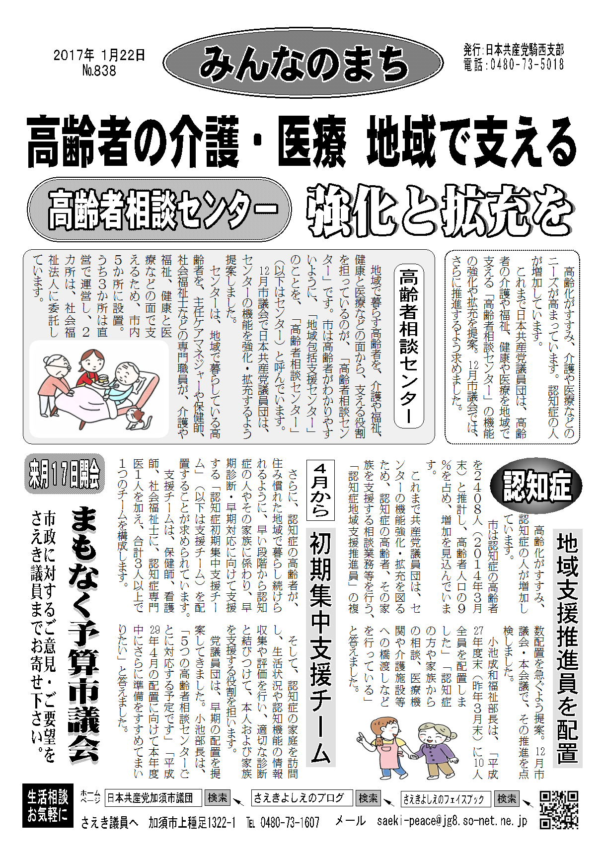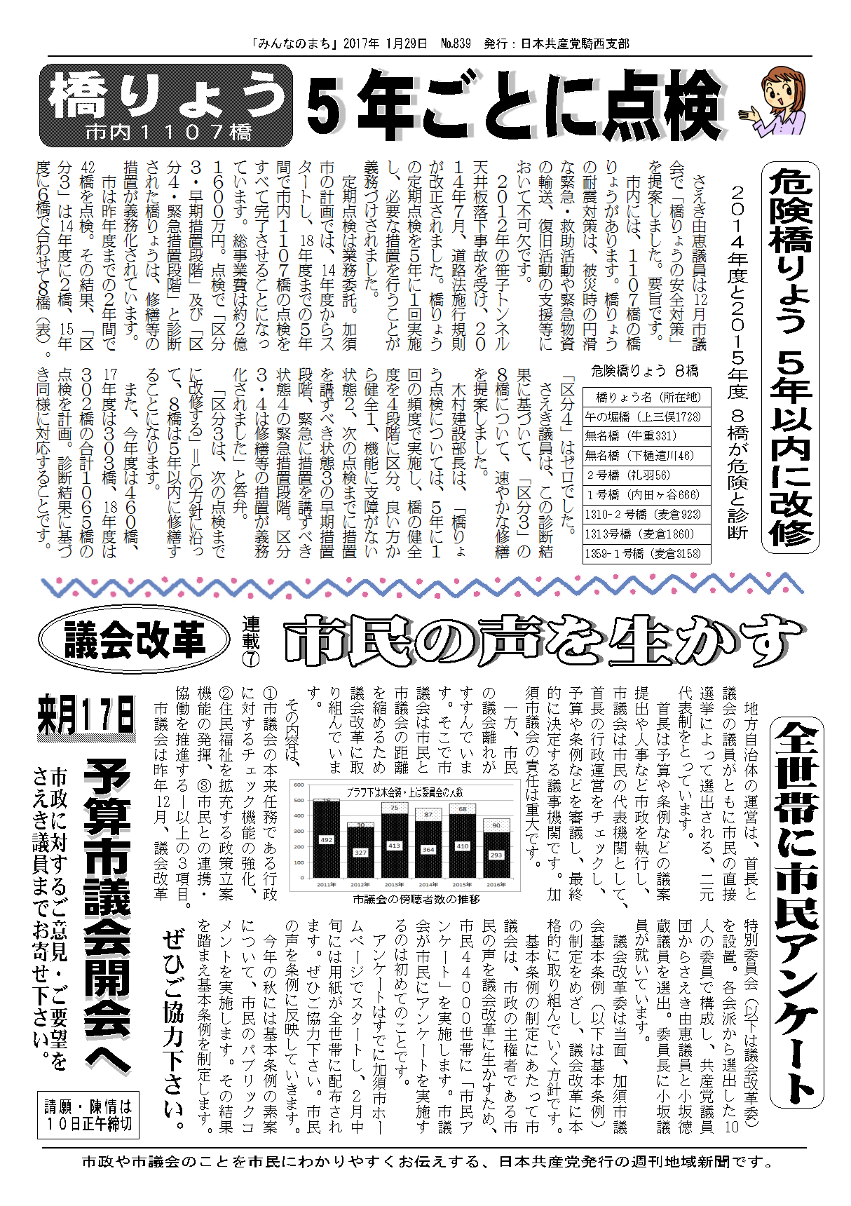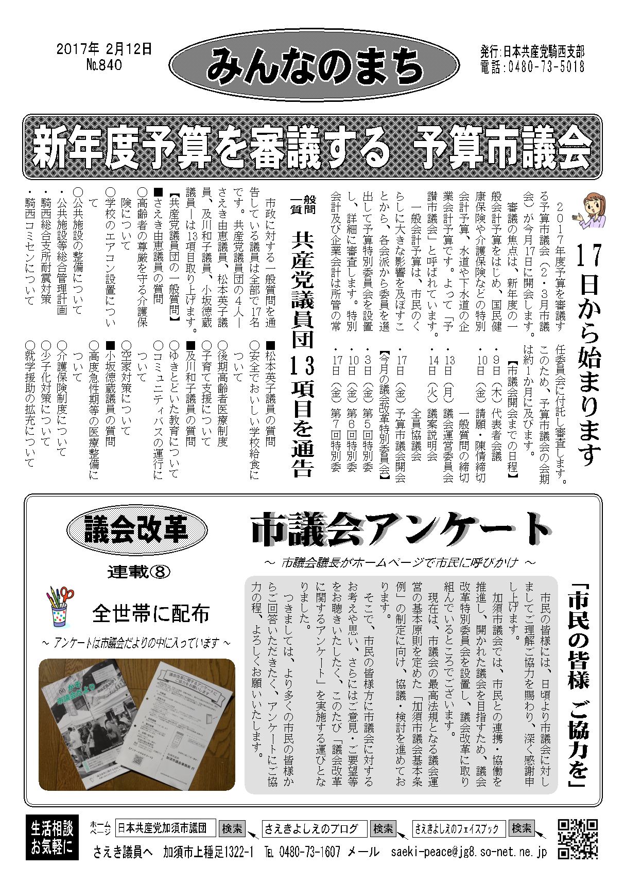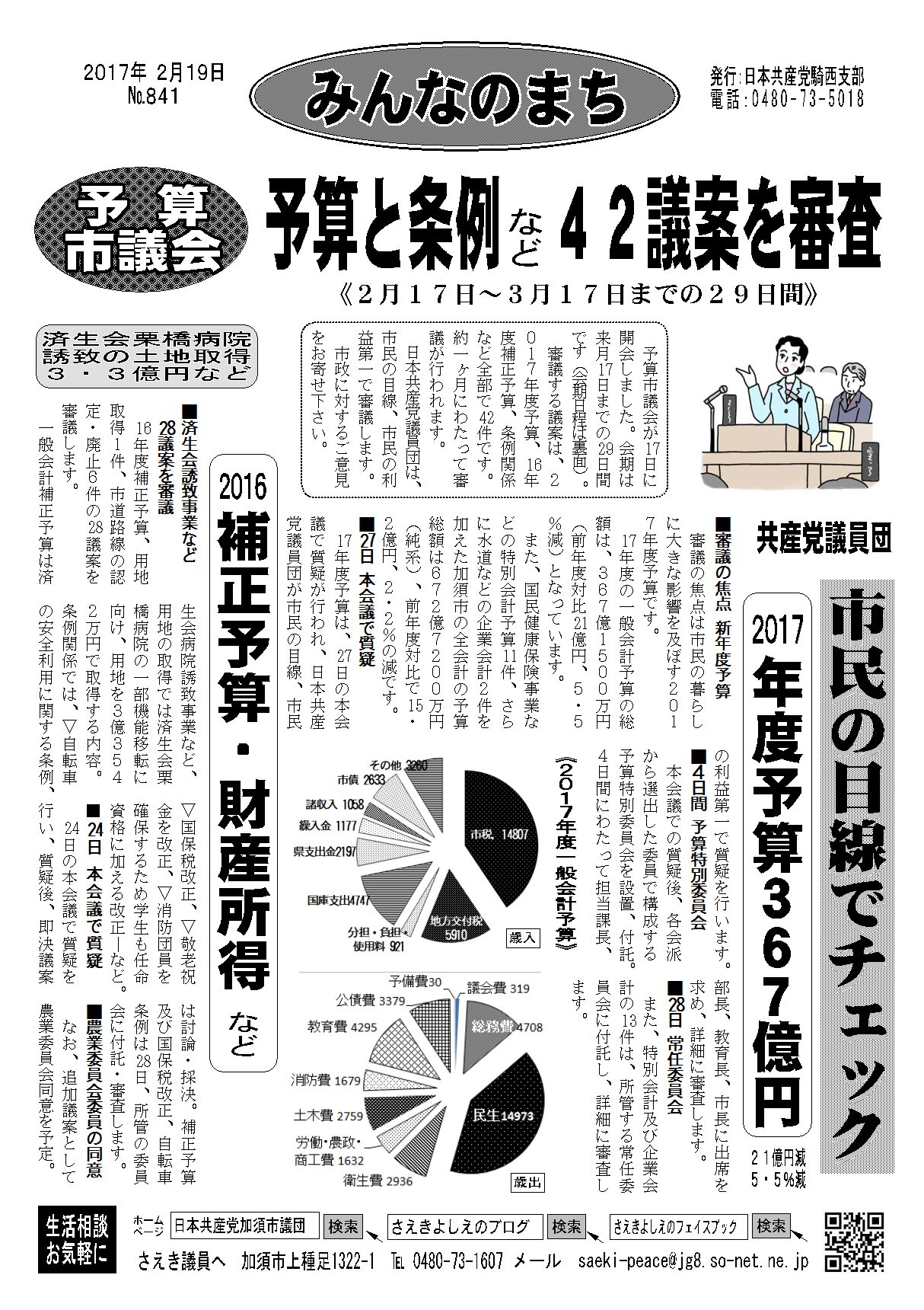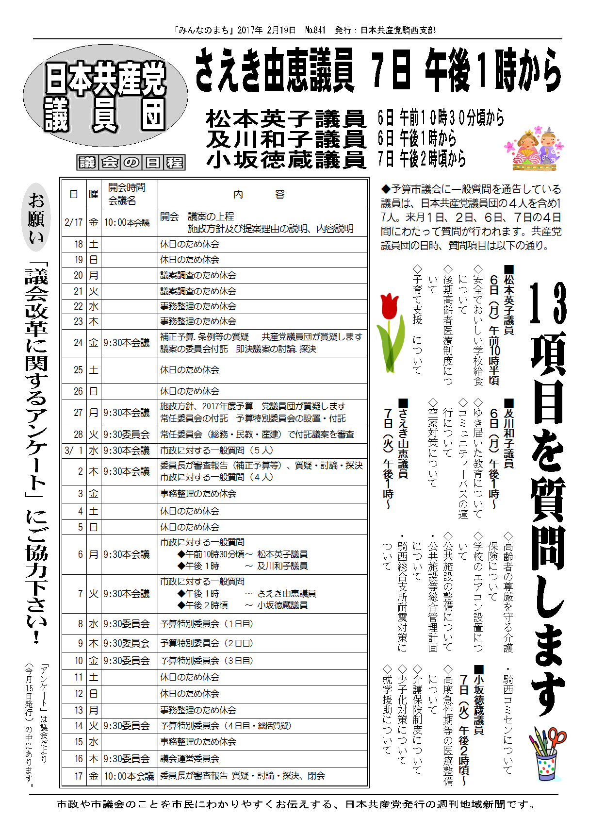 また、市政に対する一般質問では、共産党議員団4人を含め17人が通告しています。私の質問は3月7日(火)午後1時からです。