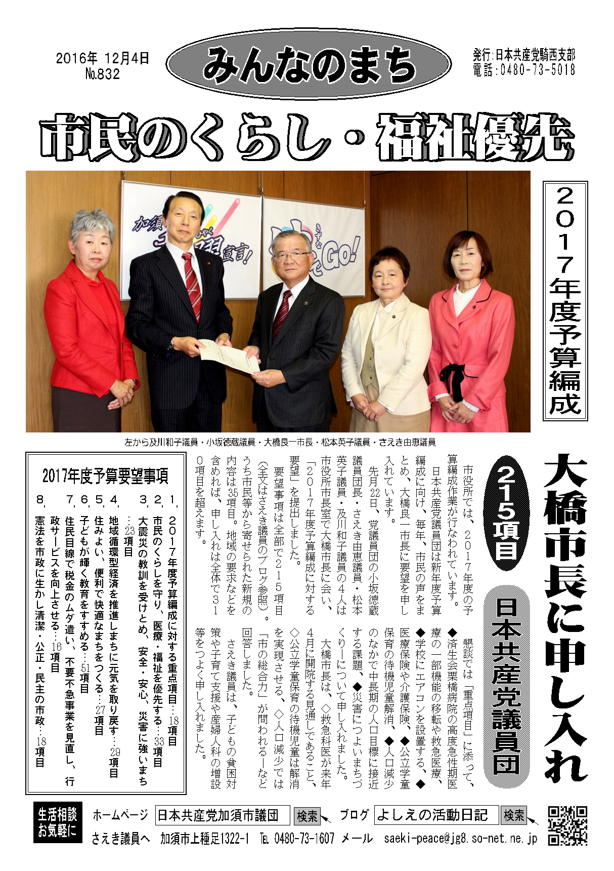 去る22日、4人の党議員団は市長室において、大橋良一市長に「2017年度予算編成に対する要望」を手渡しました。懇談で、小坂徳蔵団長が重点要望について説明。さらに私、松本英子議員、及川和子議員が地域の要望等を伝え、実現を申し入れました。