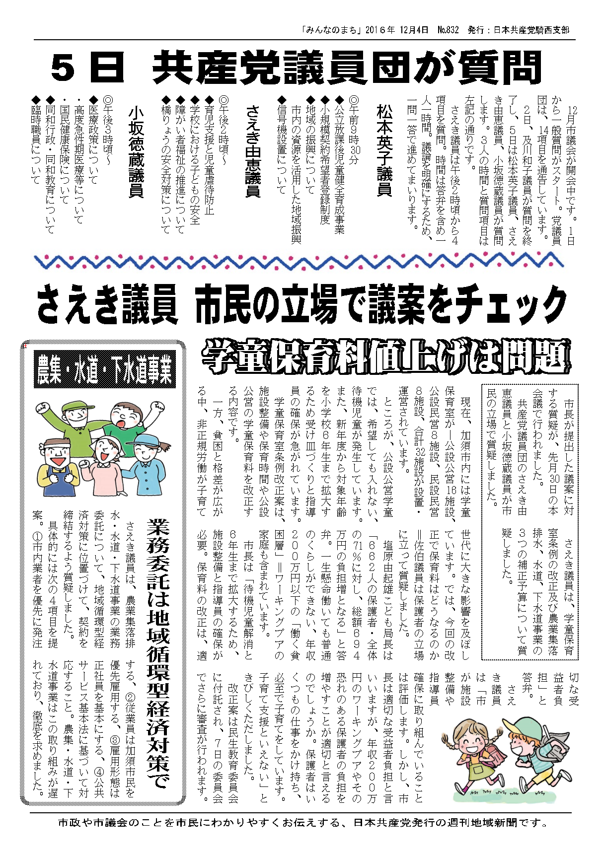 私は「市が施設整備や指導員確保に取り組んでいることは評価している。しかし、適切な受益者負担と言うが、年収200万円のワーキングプアやワーキングプアの恐れのある保護者の負担を増やし、適切と言えるのか。いくつもの仕事をかけ持ち、必至に子育てをしている。子育て支援といえない」とただしました。