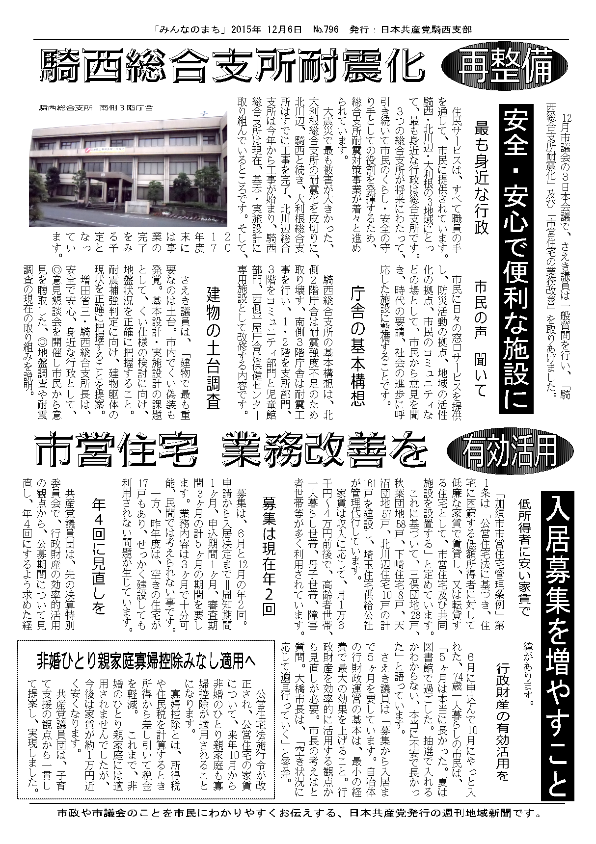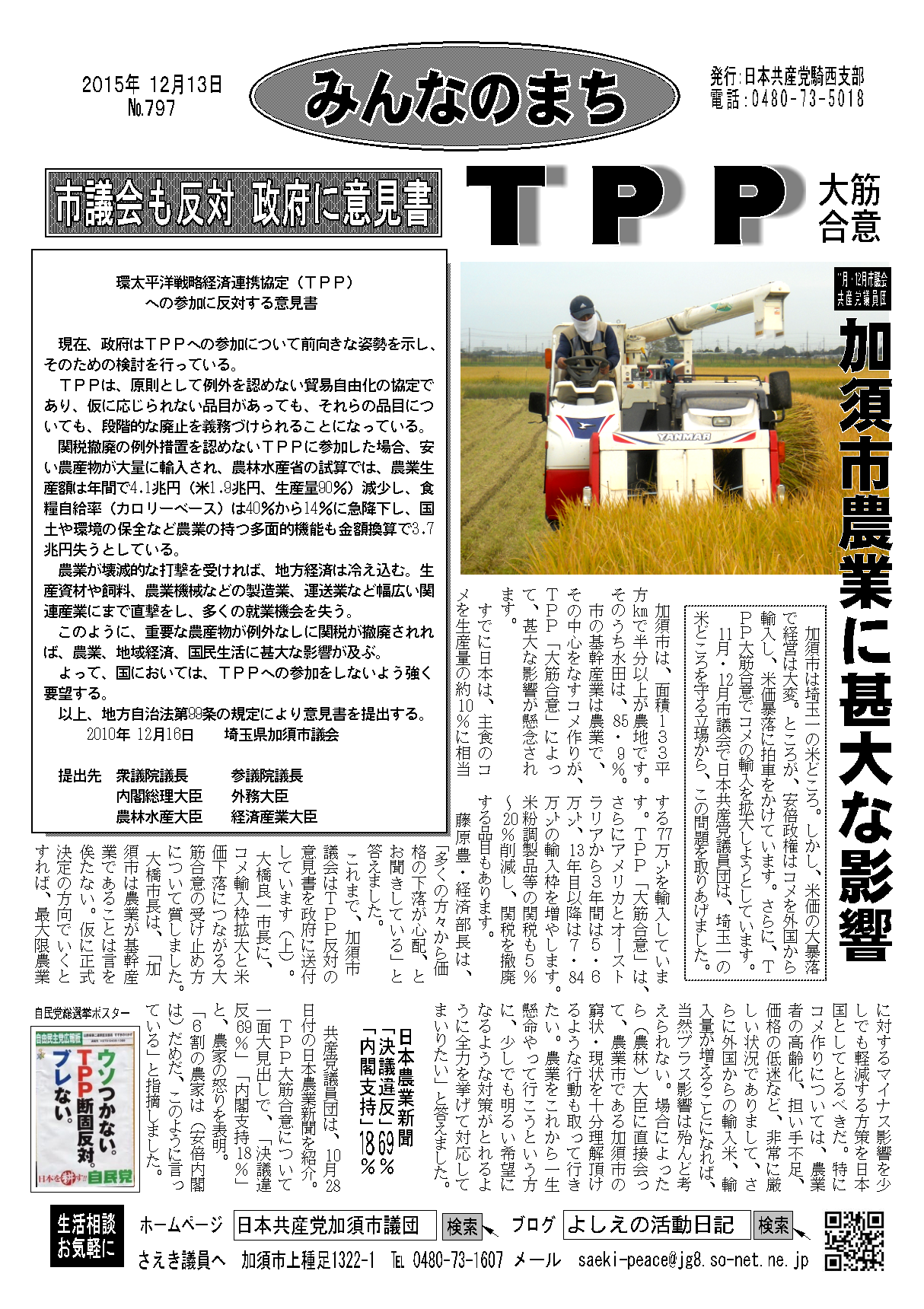 さて、2015年も残すところ3週間となりました。わが議員団は、来たる新しい年・2016年も引き続いて、市民の利益を守り、暮らし・福祉優先の市政をめざして、広範な市民のみなさんと協力・共同し、全力つくすことを表明し、討論を終わります。
