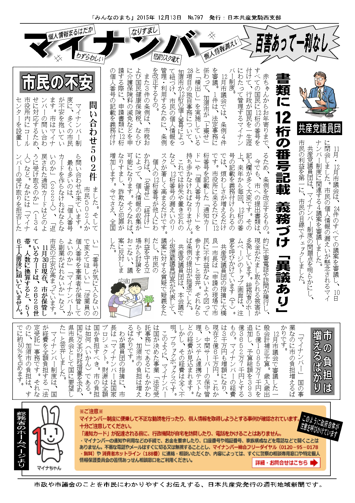 私は先般の本会議で、総務省がホームページのトップ画面で、赤い字で注意を喚起している事実を紹介しました。この画面は、現在でもまったく変わりません。それどころか、通知カード郵送の段階から実害が発生しています。