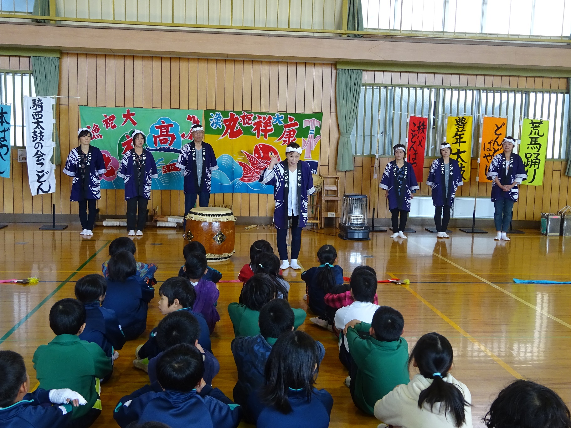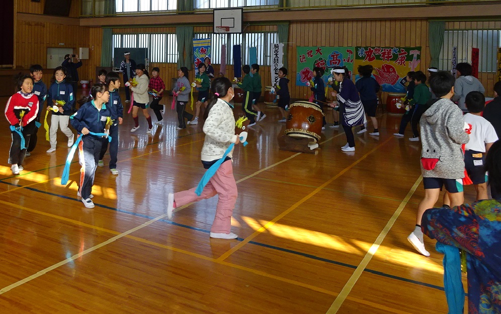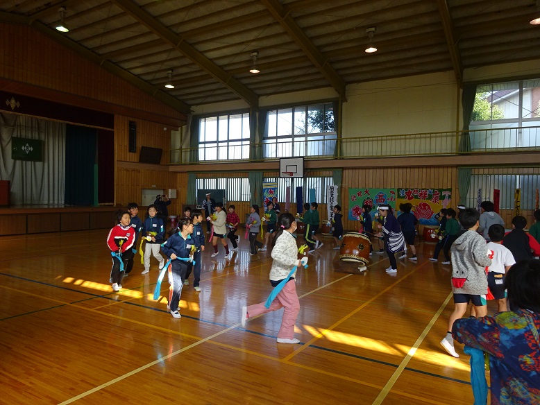 この授業は、毎年4年生を対象に実施。今回の内容は、「豊年太鼓」と「荒馬おどり」。学習を通して、「和太鼓の力強さ」や「民舞の楽しさ」を味わい、日本の文化に触れること、そして地域で活動する団体と交流することが目的。